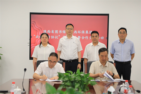 8月14日,陜西環(huán)保集團與陜西省圖書館在省圖書館高新館區(qū)簽訂戰(zhàn)略合作協(xié)議。陜西環(huán)保集團黨委書記、董事長郝軍亮,陜西省圖書館黨委書記、館長周云岳出席簽約儀式。陜西環(huán)保集團黨委副書記、董事、工會主席趙建文,陜西省圖書館黨委委員、工會主席胡竹林分別代表雙方簽署協(xié)議。